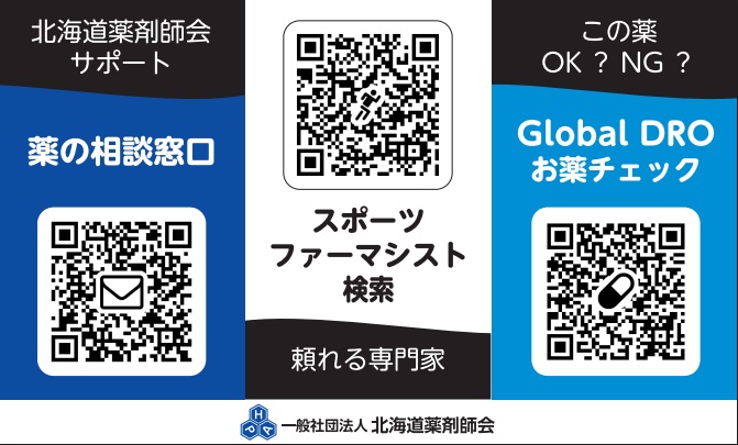 「アンチ・ドーピング アスリートサポートカード」は、スマートフォンの普及による利便性を考慮して作成されました。このカードの表面には冊子のPDF版へのQRコードが、裏面には、北海道薬剤師会の相談窓口、スポーツファーマシスト検索サイト、ドーピング該当性を確認できるGlobal DROの各サイトへのQRコードが掲載されており、緊急時や疑問が生じた際にすぐに情報源にアクセスできる仕組みです。