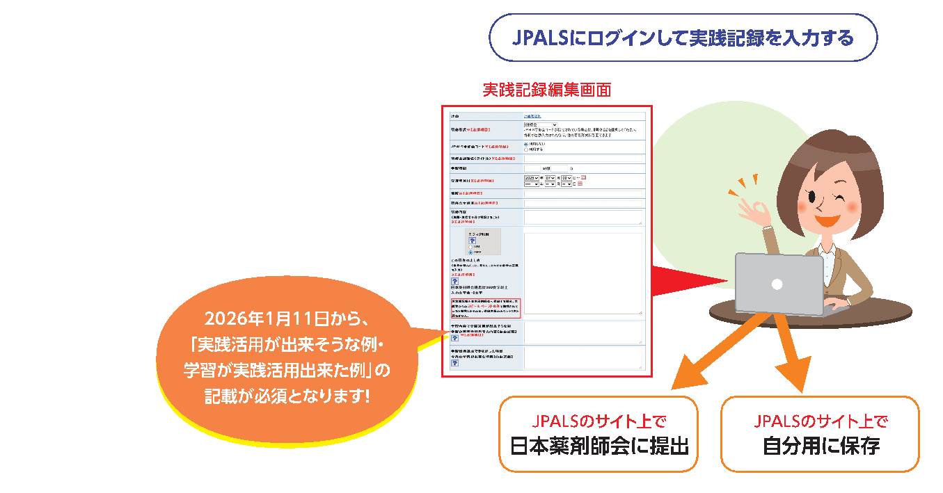 JPALS(ジェイパルス)はインターネット上で利用できる生涯学習支援システムで、会員は登録無料です。研修会、e-ラーニング、書籍、学習動画などを通じて得た知識を記録・整理し、「実践記録(ポートフォリオ)」として蓄積することで、生涯学習の定着を図ります。